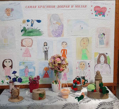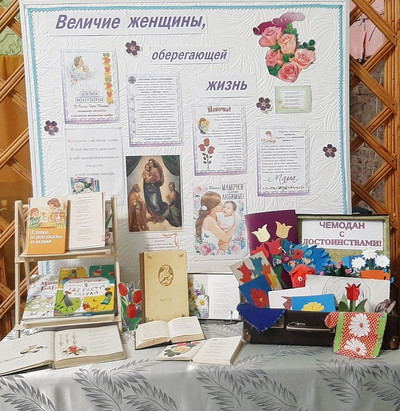 Для гостей праздника были оформлены книжная выставка «Величие женщины, оберегающей жизнь», выставка рисунков «Самая красивая, добрая и милая», выставка творческих работ «Радуга талантов» и выставка «Чемодан с достоинствами» (детские работы разных лет).
