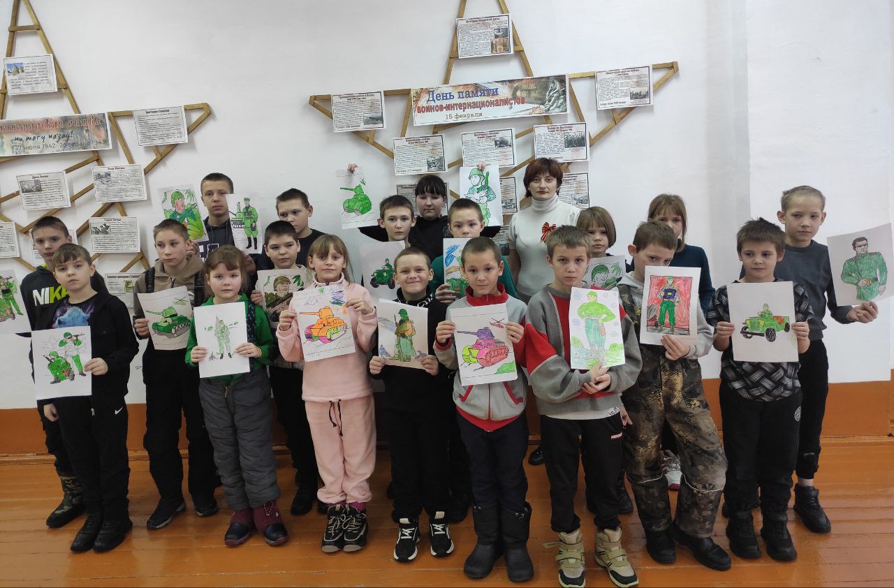 Ведущая рассказала детям о жителях посёлка Итатский, исполнивших интернациональный долг за пределами нашей Родины. Память о погибших почтили минутой молчания. Затем ребята в своих рисунках изобразили воинов-героев.