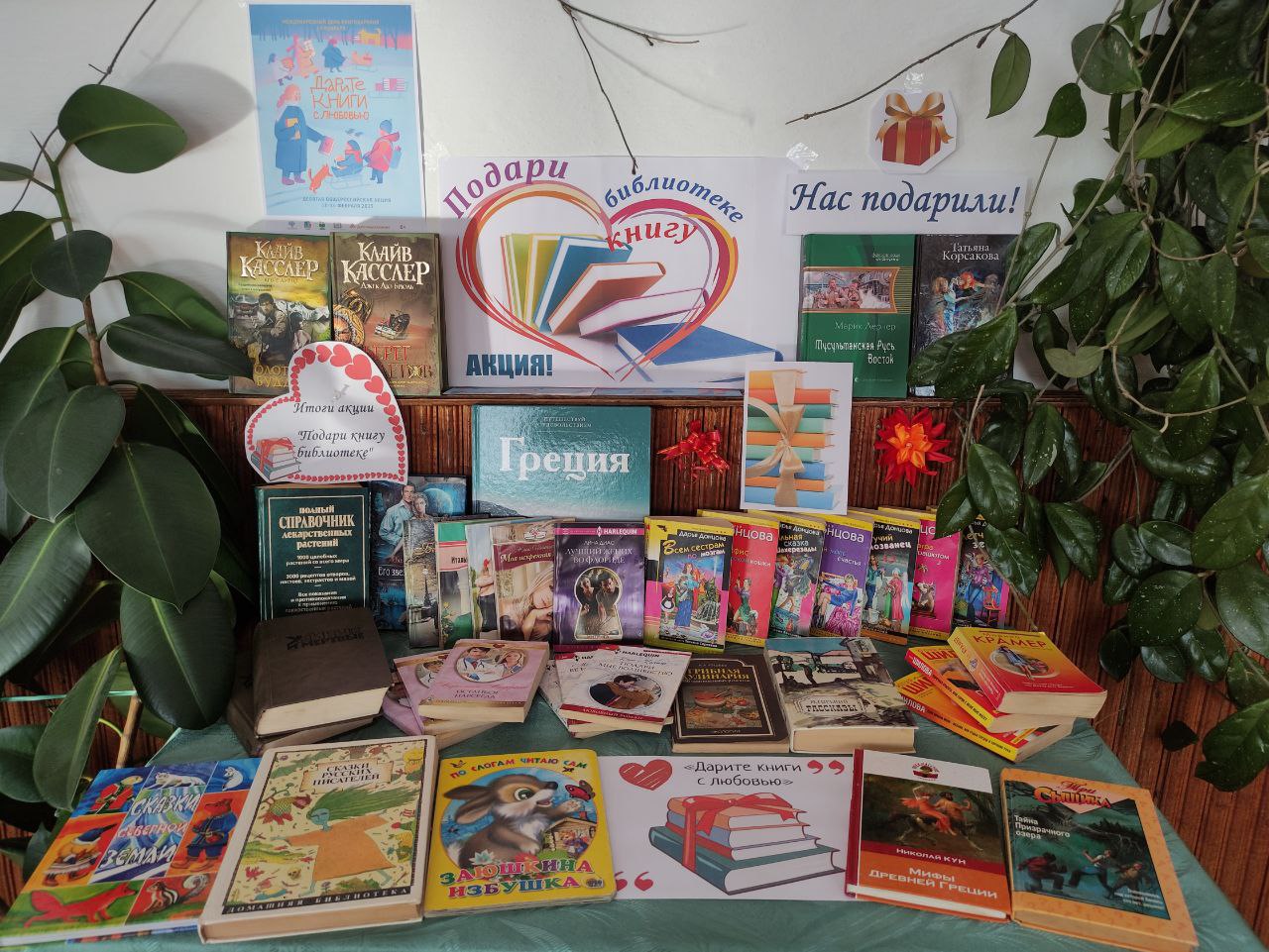 В рамках девятой общероссийской акции «Дарите книги с любовью», которая проходила с 10 по 16 февраля из подаренной литературы, а это 38 экземпляров книг для детей и взрослых, была оформлена книжная выставка «Нас подарили!».